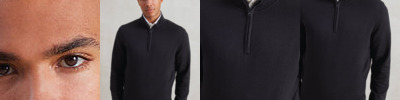 ¼ zip through collar fastening. Cotton rich yarn for a soft feel. Fine gauge knit. Set-in sleeve with ribbed knit cuffs and a ribbed hem for fitted styling.