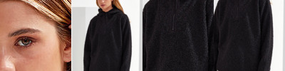 Sherpa pull-over fleece with 1/4 zip to front. Oversized fit. Hood. Matching colour binding to hood, hem, and sleeves. Drop hem to back.