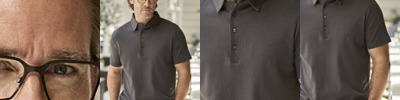 A stylish, state-of-the-art interlock polo shirt in 44 singles 100 % pima cotton, featuring a slim-fitted body. It has a self fabric stand-up collar, finished with an elegant placket with anthracite pearl imitation buttons.